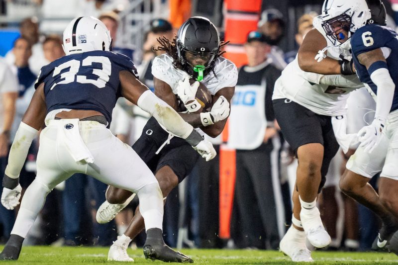 Oregon ascends to the top spot after a double-overtime win at Penn State, taking advantage of a stunning weekend of results that included losses by Georgia, LSU and Florida State.